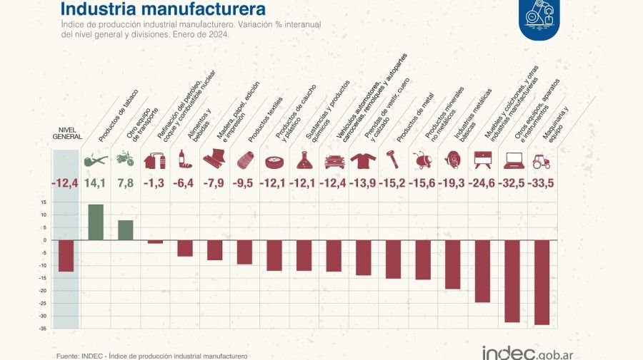 A lo largo del primer mes del año, 14 de las 16 divisiones de la industria manufacturera anotaron descensos interanuales. Ordenadas según su incidencia en el nivel general, cayeron “Alimentos y bebidas” (6,4%); “Sustancias y productos químicos” (12,1%); “Maquinaria y equipo”, (33,5%); “Industrias metálicas básicas”, (19,3%); “Otros equipos, aparatos e instrumentos” (32,5%); y “Productos minerales no metálicos” (15,6%).