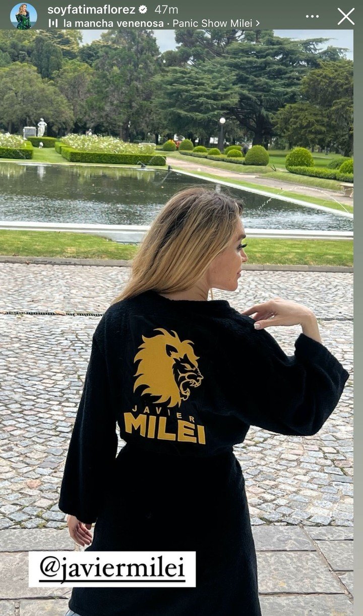 En color amarillo, la estampa muestra la silueta de un león rugiendo, con la leyenda «Javier Milei» por debajo. El posteo incluye, también, la versión «Milei» de la canción «Panic Show», la canción que el Presidente usó durante toda su campaña. Fátima, a su vez, lo etiquetó en la foto y él reposteó la historia en sus propias redes.