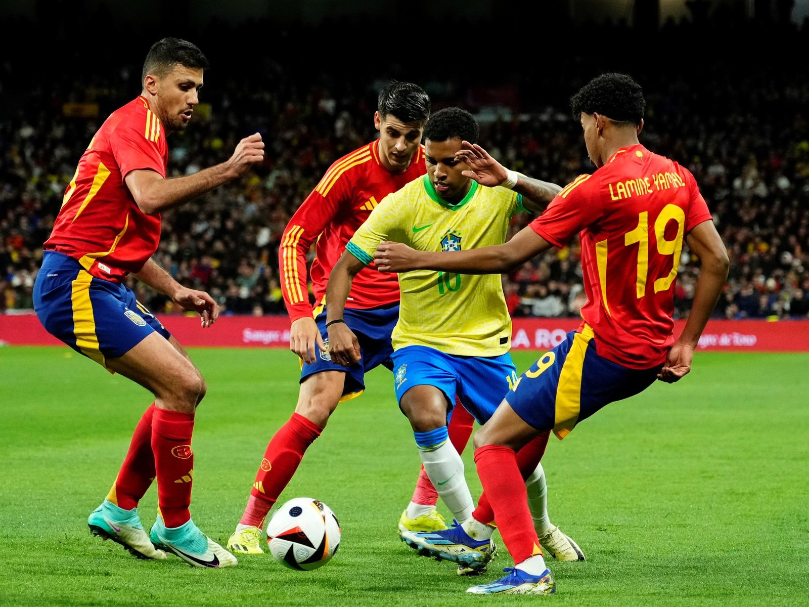 España dominó de entrada a la Verdeamarela y golpeó primero, aunque con polémica. La Roja atacó por la derecha, Lamine Yamal se metió en el área y salió al cruce Joao Gomes. A pesar que el volante brasileño le cruzó la pierna no hubo contacto y el delantero de Barcelona se dejó caer, el árbitro Nobre cobró pena máxima y, como no hay VAR, no se pudo revisar.