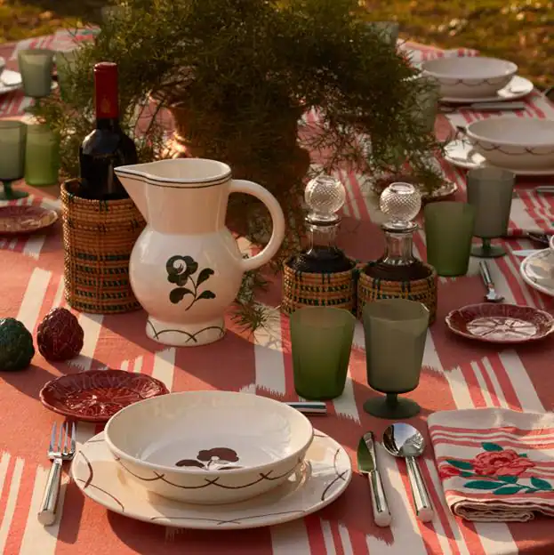Otra opción es que la vajilla esté relegada a un segundo plano, siendo el mantel el protagonista indiscutible de la composición de la mesa. Puedes decantarte por diseños que estén llenos de colores y estampados, o una opción más sencilla, pero que también llame la atención, en algún tono diferente y bordados incluidos.