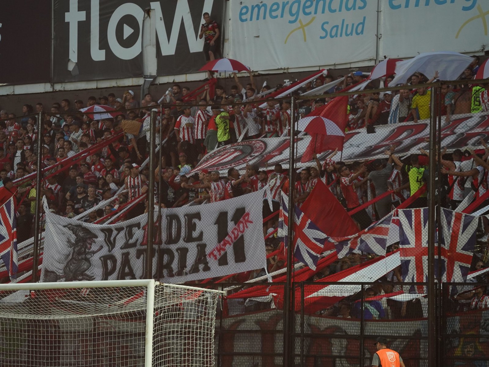 Del otro lado, la hinchada de Barracas fue al hueso y colgó una bandera contra la Bruja, a quien sin nombrarlo lo tildaron de «vendepatria» y «traidor». Además, poblaron esa ubicación con banderas de Gran Bretaña, recordando el paso del exfutbolista por tierra inglesa.