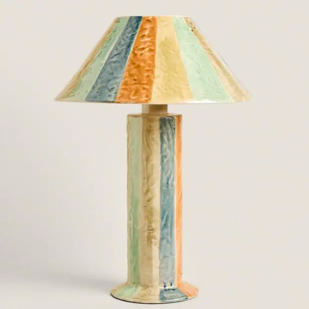 Nos hemos enamorado perdidamente de esta lámpara de mesa de cerámica con rayas multicolores, que será esa pieza por la que siempre te preguntarán tus invitados. (169 euros).