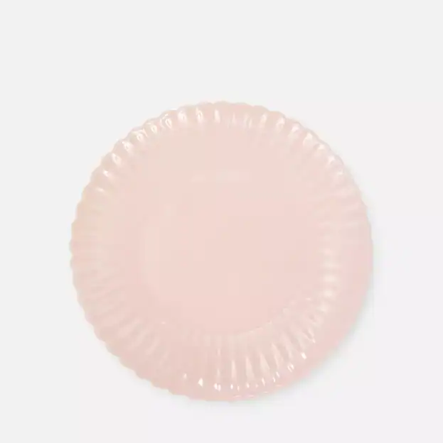 Deja a un lado los clásicos platos blancos, que nada tienen que decir, y apuesta por unos en rosa con efecto festoneado. (6 euros).