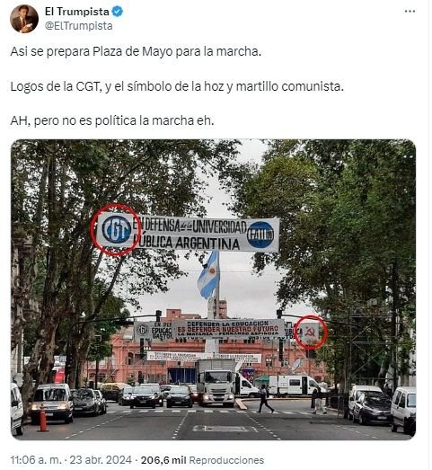 Antes de que los participantes empezaran la convocatoria, el mandatario nacional volvió a mostrarse muy activo en su cuenta de la red social X (ex Twitter). «Así se prepara Plaza de Mayo para la marcha: logos de la CGT, y el símbolo de la hoz y el martillo comunista. Ah, pero no es política la marcha, eh», afirmó uno de los mensajes que retuiteó Milei, con el objetivo de mostrar la condición «política» de la protesta.