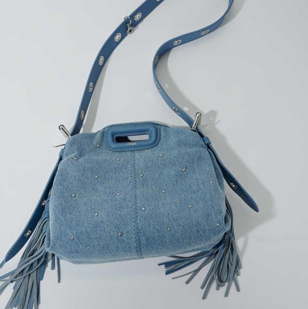 Maje ha presentador la última incorporación a su colección: Miss M, en versión vaquera esta temporada. A través de los códigos icónicos del clásico bolso M: las asas rectangulares de cuero, los flecos y las costuras detalladas, Judith Milgrom imagina el nuevo it-bag de una generación. Y esta vez llega en clave denim con tachuelas. Precio: 275 euros.