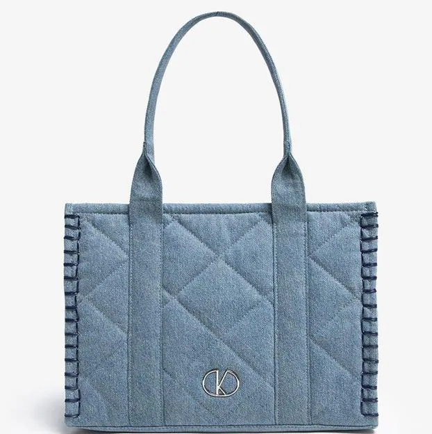 El modelo Bolso Shopping Denim Kalk se caracteriza por su forma grande y cuadrada y su doble asa al tono de diferentes largos: opta por la opción de asa corta para aportar sofisticación o por la opción de asa larga si prefieres ganar mayor comodidad. Precio: 79,99 euros.