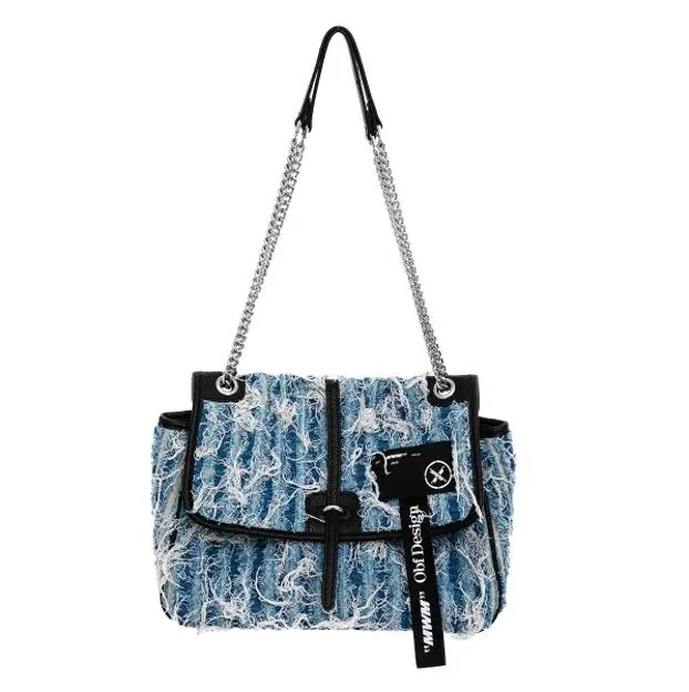 Para las más originales y las que buscan siempre un estilo urbano en sus estilismos, recomendamos la opción que tienen a la venta en Mod Wave Movement. Es un bolso diponible en dos tonos de denim con un acabado desflecado, remates en color negro y asa de cadena. Precio: 125 euros.