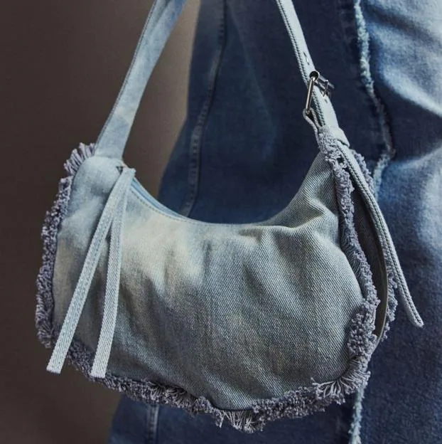 La propuesta low cost favorita está en H&M. Es un bolso de hombro en denim con acabado desflecado que va al hombro con un asa ancha y un tejido de efecto desgastado. Precio: 19,99 euros.
