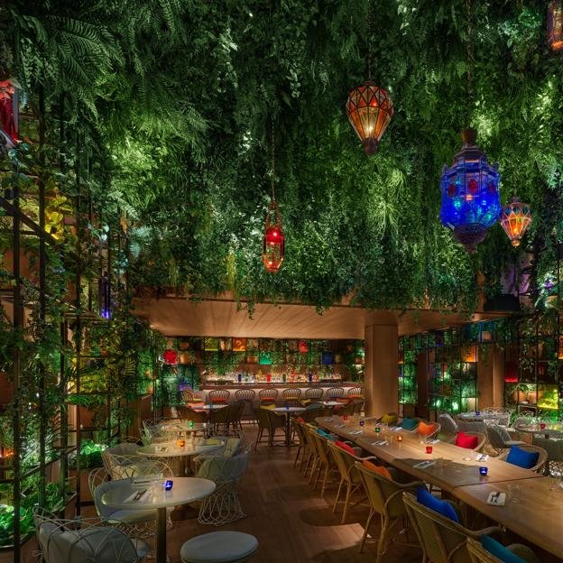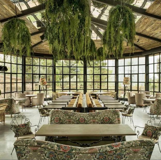 Este interiorismo es distinto a lo que hemos visto previamente, pero con el mismo objetivo, calar hondo en el comensal. Se inspira en el ambiente natural y la «organic vibe», protagonizando el espacio enredaderas naturales y materiales como el lino, el cuero o la lana.