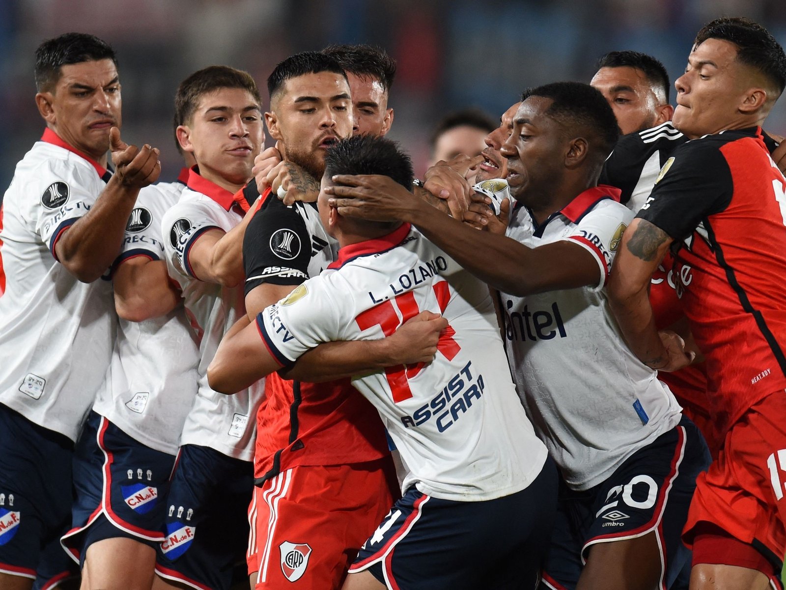 El segundo tiempo entre River y Nacional en Montevideo por la Copa Libertadores arrancó accidentado. Una brutal entrada de Leandro Lozano contra Rodrigo Aliendro derivó en una tangana entre los futbolistas de ambos equipos. El defensor uruguayo no llegó a impactar de lleno al mediocampista de River, pero debió ser expulsado por la imprudente forma en que se lanzó con los pies hacia adelante.