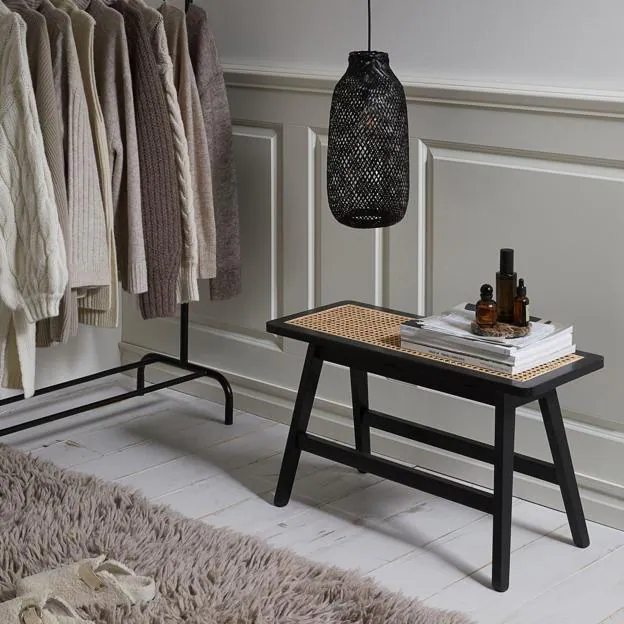 Otra opción de mobiliario, que nos ha encantado, es este banco de ratán con una combinación de colores muy bonita, marcada por el contraste del negro y el beige. (169 euros).