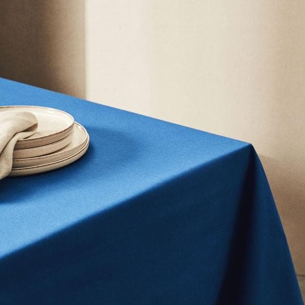 Si durante la primavera los manteles se llenan de flores, en verano lo hacen de colores vitaminas, como el azul Klein, que es uno de los grandes predilectos, especialmente en el estilo mediterráneo (14,99 euros).