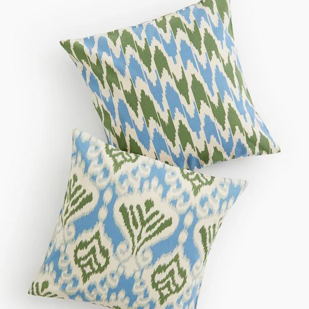 Otra opción de cojines, que siguen toda la estela de la colección, con esa gama cromática de azules y verdes, pero con la clásica forma cuadrada (9,99 euros).