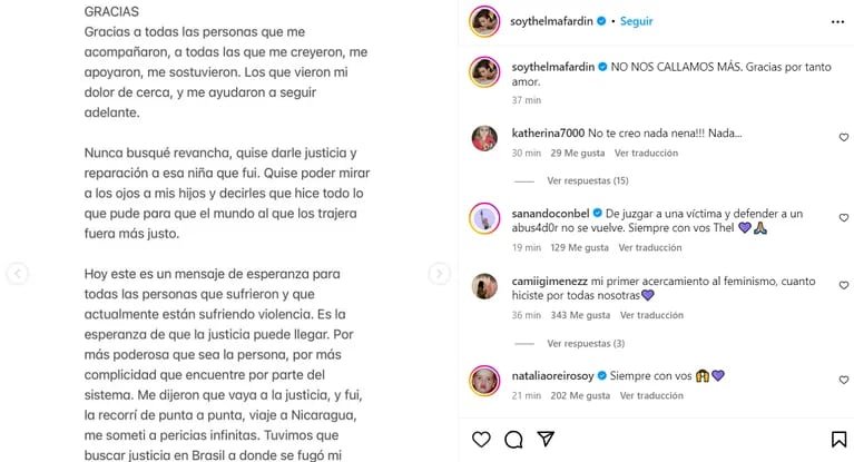 En la publicación, también compartió una desgrabación de lo que expresó en la conferencia de prensa donde celebró que su caso haya recibido justicia. “Siento que todo el esfuerzo valió la pena. Hoy peso mucho menos”, sostuvo. Y remarcó: “Había perdido la esperanza y la fe en la justicia”.