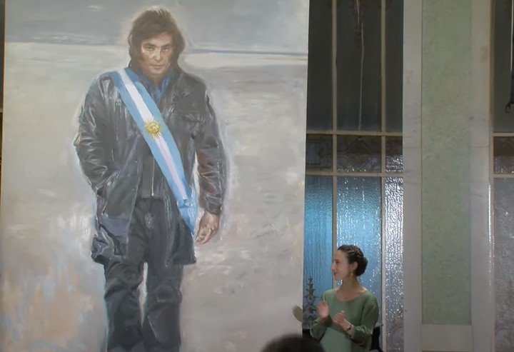 Al finalizar la disertación de Huerta de Soto, descubrieron el enorme retrato que le regalaron al Presidente, donde se lo ve con el camperón de cuero y la banda presidencial.