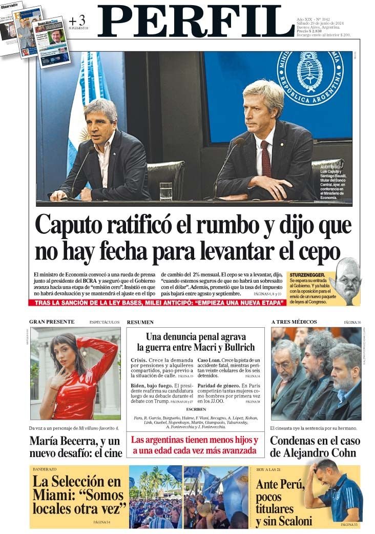A continuación ofrecemos un repaso de los principales título de la edición 1.942 del Diario PERFIL, de este sábado 29 de junio de 2024, un número al que acompañan este fin de semana 3 suplementos que recorren los temas más variados, tanto informativos como de entretenimiento: Espectáculos, El Observador y Buenos Aires Times: