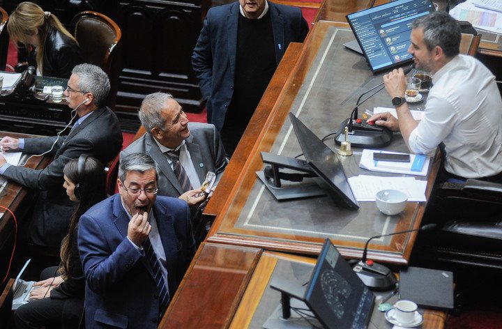 El incidente con la Marcha Peronista ocurrió a la 1.20 de la madrugada, mientras hablaba Bornoroni. «Que apaguen la música, que apaguen la música», fue el reclamo generalizado del oficialismo y algunos aliados, mientras el jefe de bloque de LLA miraba a un costado, distraído por el sonido intruso. «Irrespetuosos», siguió otra legisladora. Y Nadia Márquez, de Neuquén, le sopló al oído a Bornoroni: «Es la Marcha Peronista».
