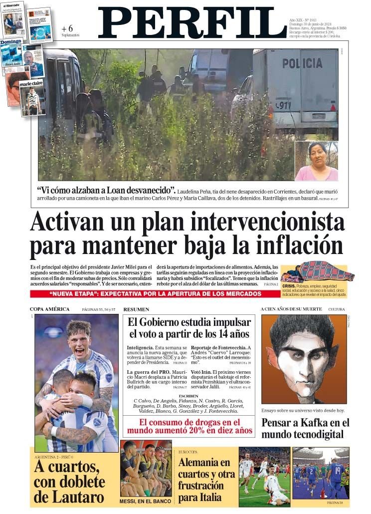 A continuación ofrecemos un repaso de los principales títulos de la edición 1.943 del Diario PERFIL, de este domingo 30 de junio de 2024, un número al que acompañan, como cada fin de semana, 6 suplementos que recorren los temas más variados, tanto informativos como de entretenimiento: El Observador, Espectáculos, Domingo, Cultura, Marie Claire y Sólo por gusto: