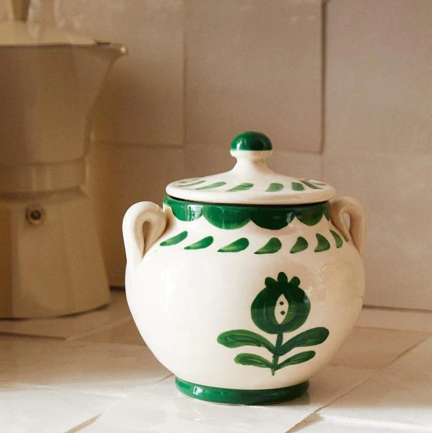 Su función principal es la de azucarero, pero la verdad es que puedes darle la utilidad que necesites. Está fabricando en cerámica con los detalles pintados a mano en verde, que hacen de esta pieza algo único (12,99 antes 17,99 euros).