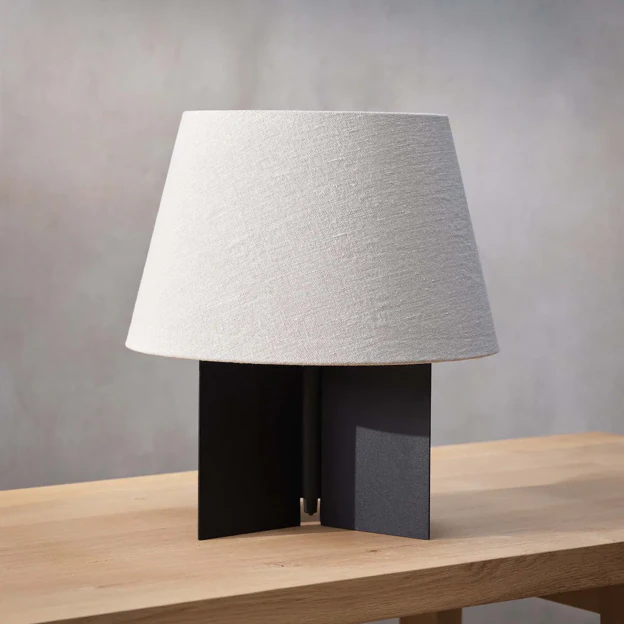 Por último, pero no menos importante, entramos en el terreno del diseño nórdico. Esta opción destaca por su diseño geométrico y sofisticado, con una base única en forma de cruz hecha de metal lacado, que le da un aspecto moderno y elegante. Esto se combina con una pantalla de lino que crea un contraste atractivo, combinando la calidez del lino con la suavidad y frialdad del metal (199 euros).