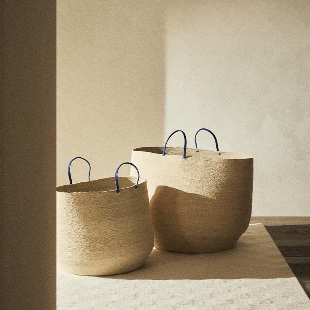 Para guardar las mantas, la ropa sucia o simplemente como decoración, las cestas de seagrass tienen mil posibilidades en la decoración de tu hogar. Son cómodas, útiles y versátiles, y estas con el asa en azul no nos pueden gustar más (49,99-59,99 euros).