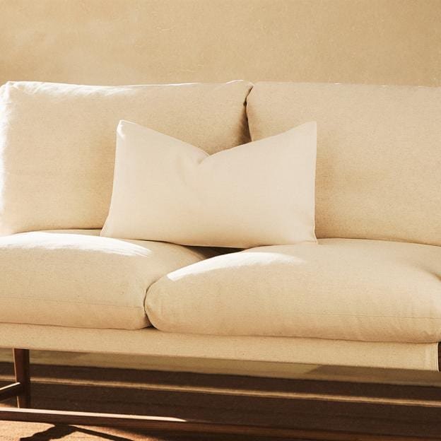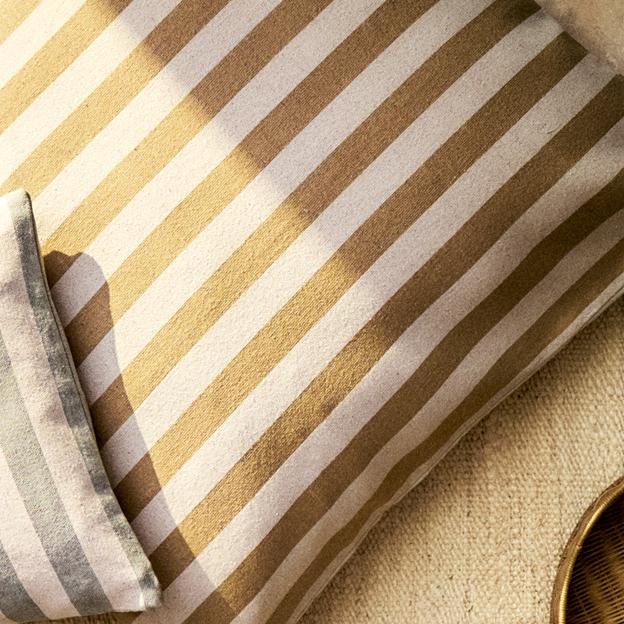 Los cojines siguen siendo uno de nuestros accesorios predilectos, ya que tienen la capacidad de cambiar el aspecto de una habitación en un solo gesto. Este con estampado de rayas en marrón aporta ese toque mediterráneo tan ideal (49,99 euros).