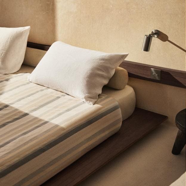 En la ropa de cama también nos hemos llevado una sorpresa con estas sábanas de rayas ideales confeccionadas en lino, que cuenta con una combinación de colores diferente, pero que al mismo tiempo da mucho juego (39,99-69,99 euros).
