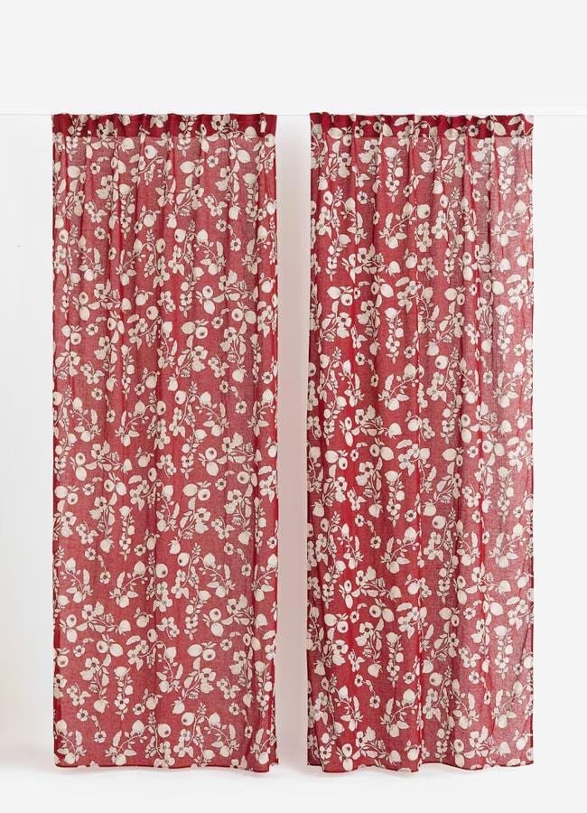 Hasta las cortinas se han teñido de flores, y prueba de ellos son estas en color rojo. En mezcla de lino y algodón, son una forma sencilla pero muy eficaz de dar un toque original a cualquier habitación de tu casa (49,99 euros).