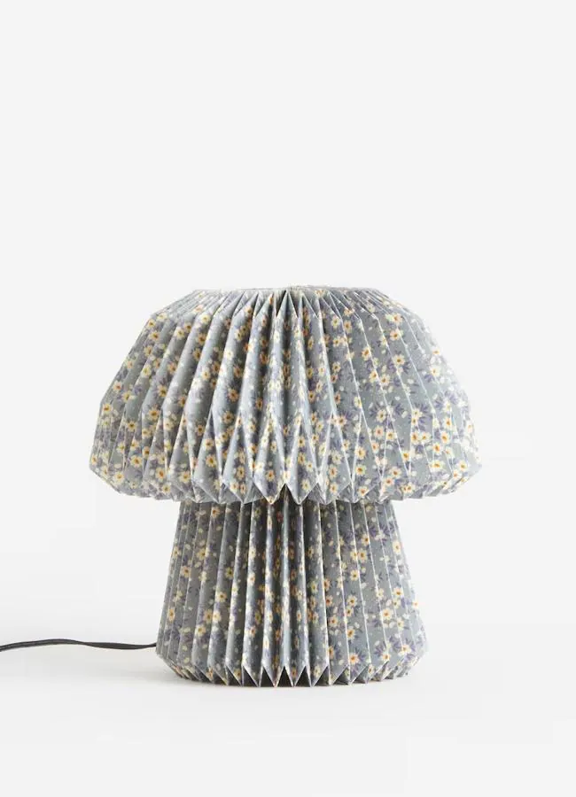 Esta lámpara de mesa en papel plisado con estampado floral aportará un toque personal a tu hogar, prescindiendo de las opciones más clásicas, y lanzándote de lleno a esa estética kitsch, que tanta popularidad ha ganado (29,99 euros).