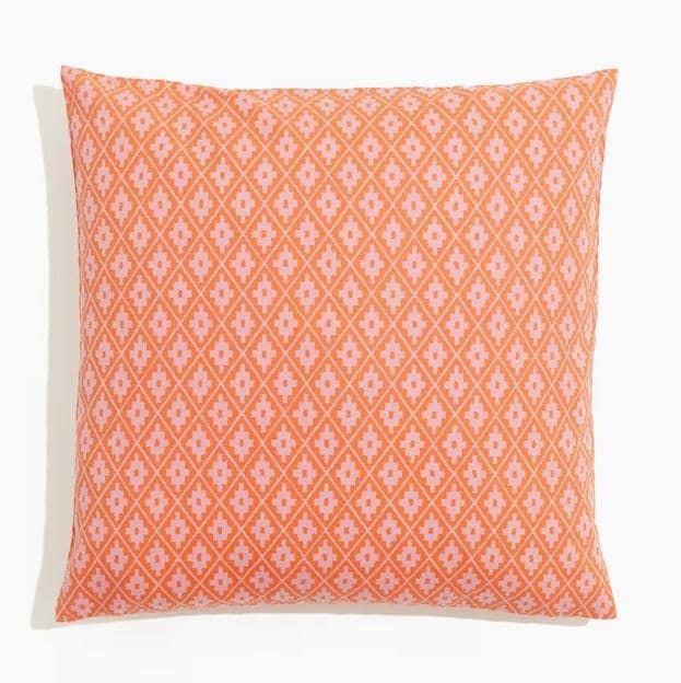 Ese sofá blanco que tienes en la terraza puede dar mucho juego, ya que es un color al que le podemos añadir cualquier cosa que nos apetezca. Si estás en ese punto que te apetece experimentar, este cojín en rosa y naranja es perfecto para ello (9,99 euros).