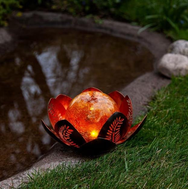 Otro detalle decorativo que nos ha llamado mucho la atención, es esta flor con hojas metálicas de color cobre y con una gran bola de cristal de color ámbar en el interior que se ilumina con un brillo de color dorado muy bonito (44,99 euros).