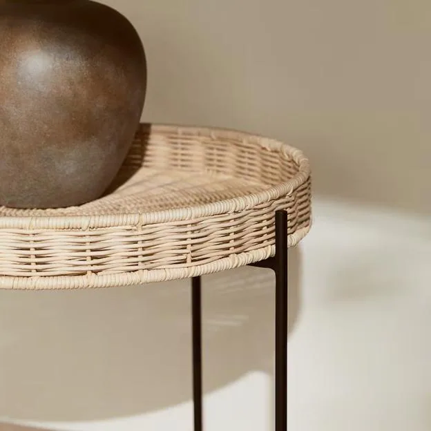 También incluimos muebles en esta selección, como esta mesa redonda de ratán y patas metálicas, que es una de nuestra combinación de materiales preferida, especialmente en la decoración de exteriores (79,99 euros).