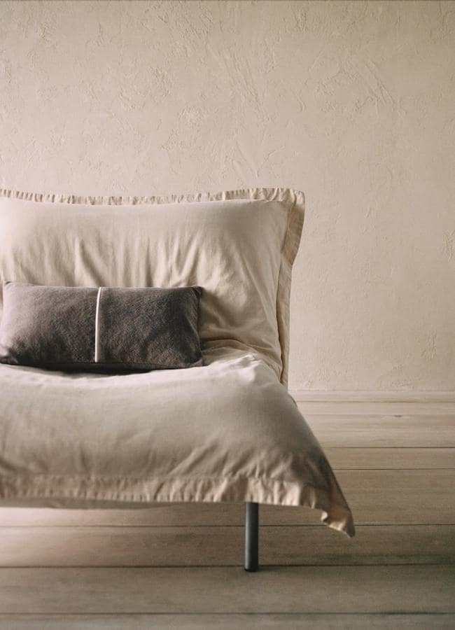 Los cojines son una de nuestras inversiones preferidas, porque ayudan a crear dimensión y aderezar el espacio de la mejor forma. Este diseño de lino marrón con ribete en blanco no nos puede gustar más (19,99 euros).