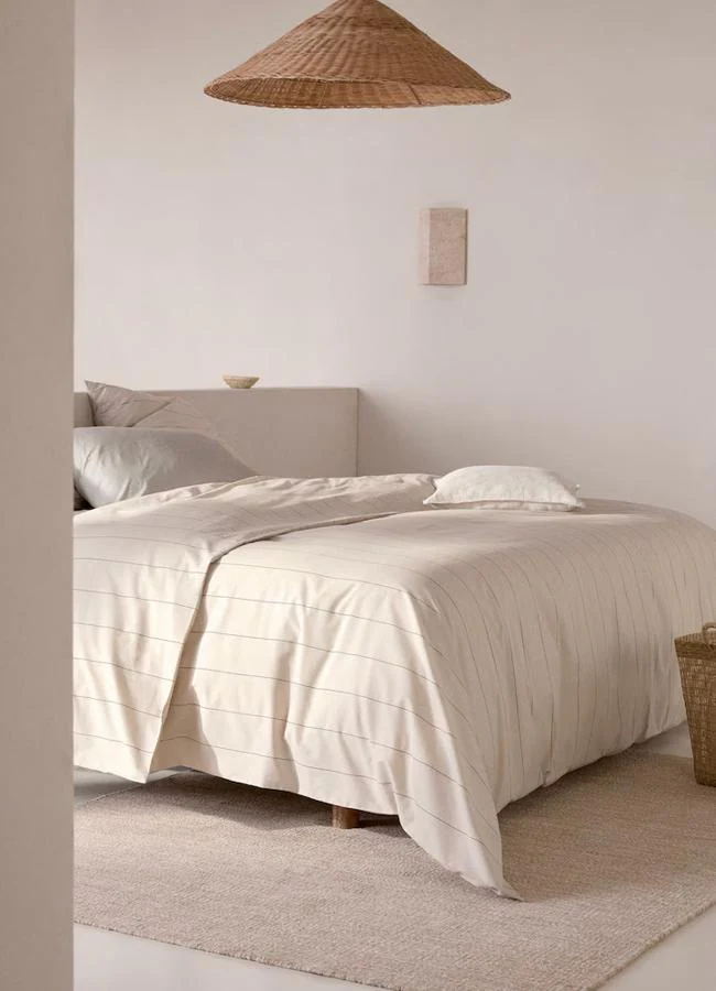 Para el dormitorio también suele proponer fundas nórdicas muy bonitas, minimalistas y con una gran calidad. Como esta, confeccionada en 100% de algodón en color blanco y con rayas negras, abogando por el clásico binomio (39,99 euros).