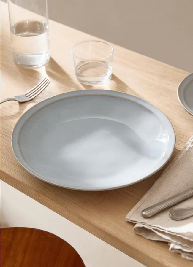 A juego con el bol anterior, aunque con otra combinación de colores, fichamos estos platos con el mismo diseño en gres envejecido y un color azul precioso que te dará mucho juego a la hora de conjuntar con el resto de elementos (9,99 euros).