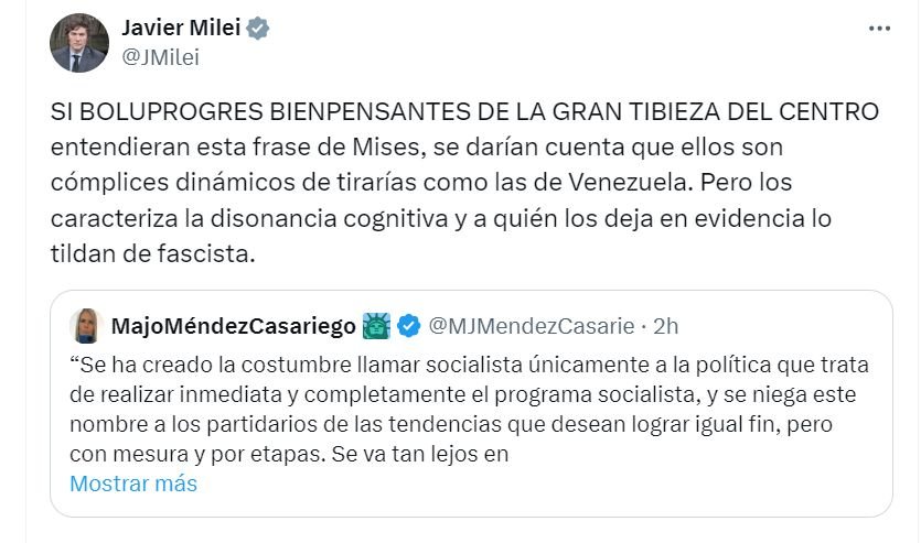 La frase en cuestión de Mises, rescatada por la usuaria Majo Méndez Casariego, plantea: «Se ha creado la costumbre llamar socialista únicamente a la política que trata de realizar inmediata y completamente el programa socialista, y se niega este nombre a los partidarios de las tendencias que desean lograr igual fin, pero con mesura y por etapas. Se va tan lejos en esta materia, que se considera enemigos del socialismo a quienes intentan ponerlo en práctica con ciertas restricciones».