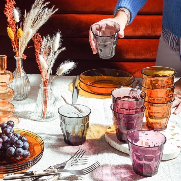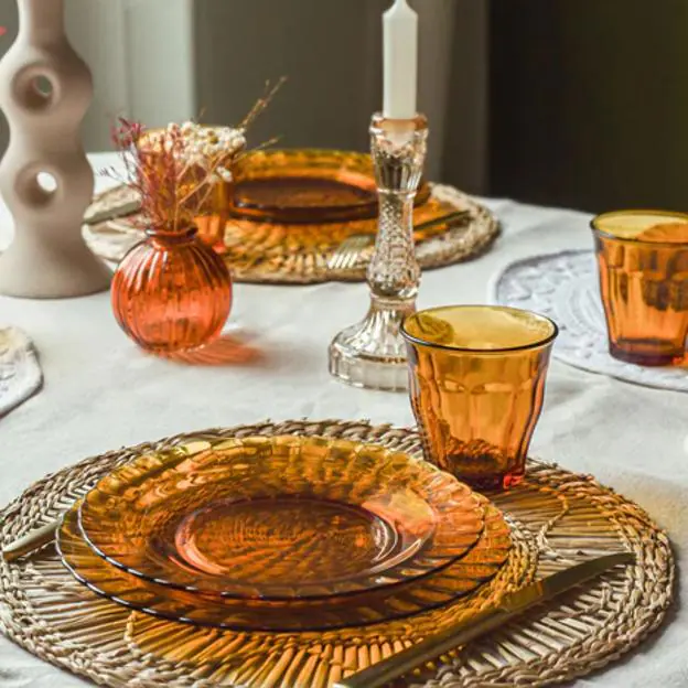 Pero más allá de los recuerdos, de su carácter irrompible y ultrarresistente y de su durabilidad, el éxito de las vajillas de Duralex está en su diseño minimalista y atemporal. Da igual el tiempo que pase, su reconocible silueta, su festoneado o sus tonos ámbar o verde se adaptan a las tendencias en mesas porque admiten casi cualquier complemento decorativo.
