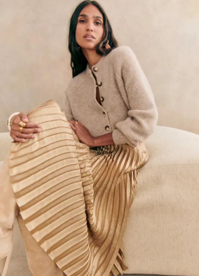 El primer truco de estilo que hemos aprendido de las francesas sobre el cárdigan que llevaban nuestras abuelas es que en 2024 podemos seguir luciéndolo como lo hacían ellas: con faldas midi. Eso sí, en versión actualizada. Las satinadas y plisadas son un sí, pero las caladas o los vestidos de verano a los que queremos alargar la vida, son una genial idea.