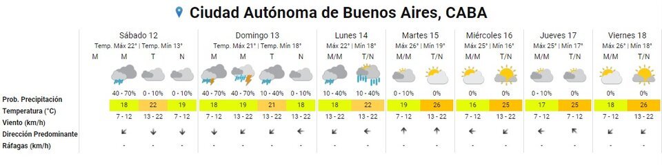 El domingo habrá tormentas durante buena parte del día. La lluvia cesará hacia la noche. El SMN pronosticó una temperatura mínima de 15 grados y una máxima de 20 grados.