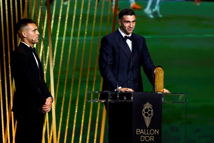 “Muchas gracias a todos. Es un honor estar acá otra vez. Agradecido al Toro por meter el gol en la final (de la Copa América), a la Selección, a los entrenadores de arqueros que me acompañan hoy. Lo individual siempre viene después de lo grupal”, sostuvo al recibir el trofeo de manos de Lautaro Martínez, su compañero en la Selección, que quedó como el séptimo mejor futbolista del año en la premiación principal. Luego, mostraron un video con los highlights de su espectacular temporada bajo el título de “El impasable”. Las imágenes estaban musicalizadas con la melodía de un Western.