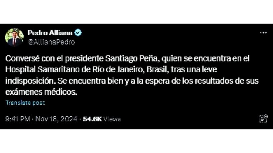 «Conversé con el presidente Santiago Peña (…). Se encuentra bien, a la espera de los resultados de exámenes médicos«, indicó más temprano el vicepresidente paraguayo, Pedro Alliana, en la red social X.