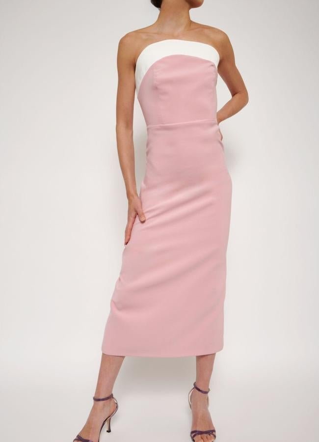 Este rosa clarito viene pisando muy fuerte esta temporada. Y aunque todavía no hay muchas opciones en el mercado, hemos encontrado este modelo midi bicolor, con escote palabra de honor asimétrico de Nicolás Montenegro (175 euros en ES Fascinante)
