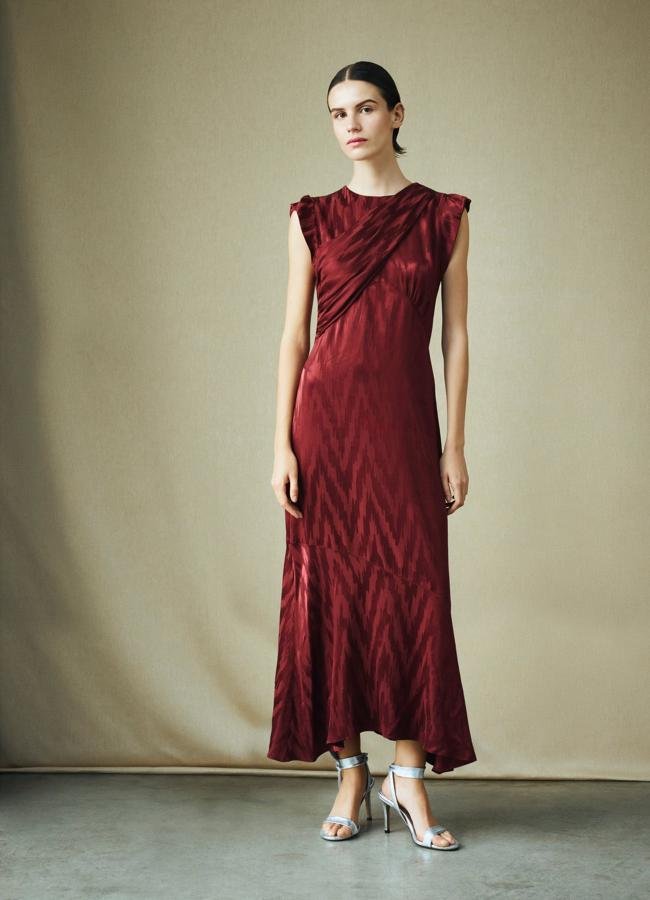 Se define como rojo vino, es decir, un rojo intenso que se parece al granate y que no llega a ser burdeos, otro de los tonos tendencia. Para probarlo, nos encanta este vestido de Maksu con un sutil estampado en zigzag y con un cuerpo cruzado con unas mangas finas (165 euros).