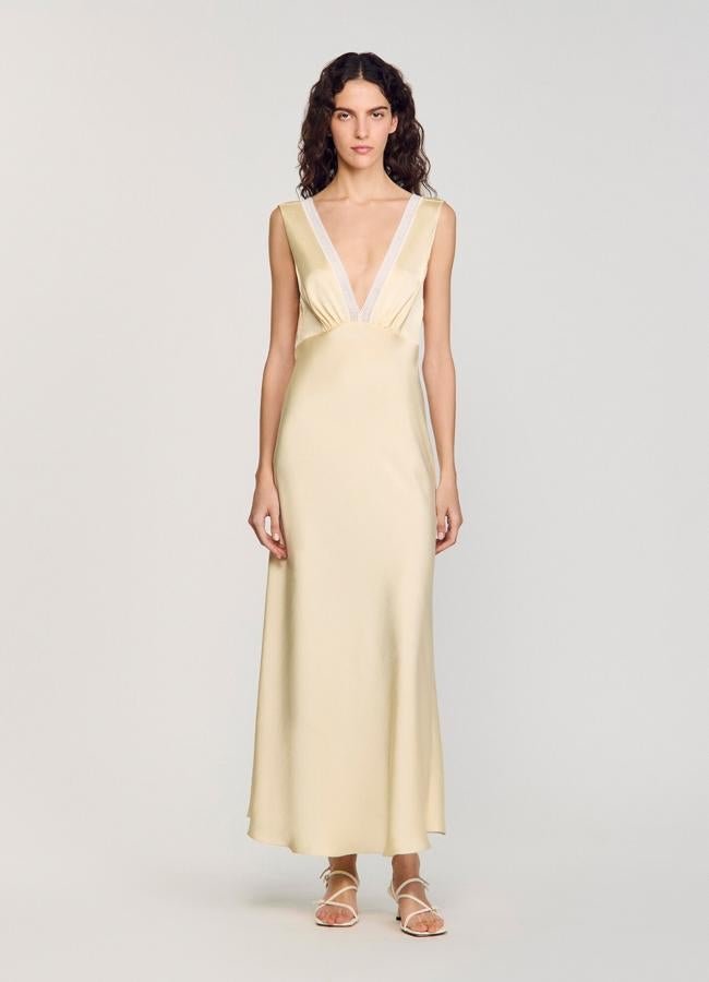 Este amarillo mantequilla no a todo el mundo le queda bien, pero es un tono que se lleva muchísimo y que puede hacerte conseguir un look perfecto. Si crees que es para ti, ficha este vestido satinado y elegantísimo de Sandro con escote en pico y una caída muy especial (265 euros).