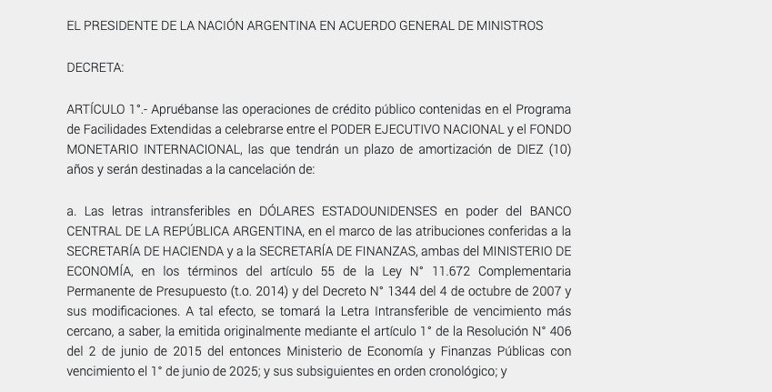«Apruébanse las operaciones de crédito público contenidas en el Programa de Facilidades Extendidas a celebrarse entre el Poder Ejecutivo Nacional y el Fondo Monetario Internacional que tendrán un plazo de amortización de diez años«, señala el decreto que fue publicado en el Boletín Oficial.