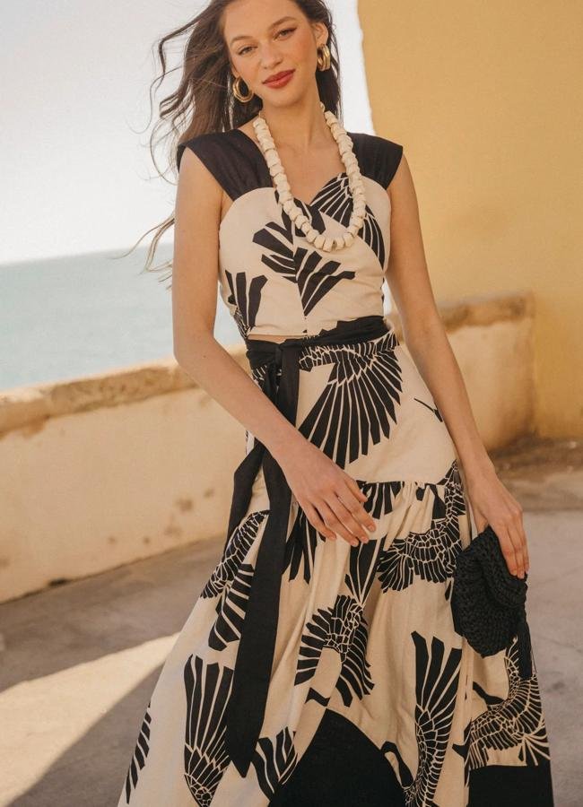 Entre los estilismos que proponen desde Cherubina también encontramos conjuntos de dos piezas tan especiales como este. Formado por top y falda larga con vuelo, ambas prendas con estampado geométrico en color negro, vale tanto para un evento más elevado como para otros con tintes más formales.