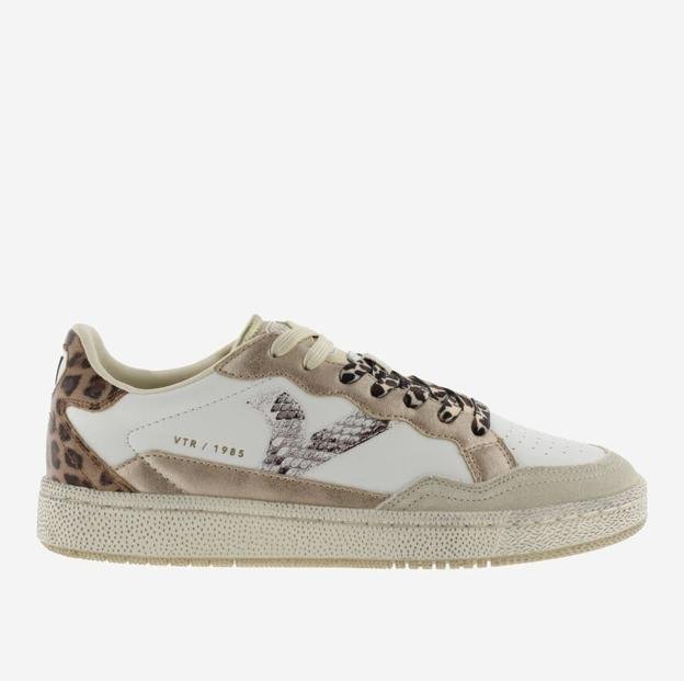 Estas zapatillas están confeccionadas en piel con piezas superpuestas de microfibra metalizada. Lleva la V retro en el lateral en «snake PU», y talonera en serraje con estampado animal print y etiqueta de goma. Además, incluyen plantilla ergonómica que se adapta a la forma del pie y regala la sensación de comodidad. Precio: 89,90 euros.