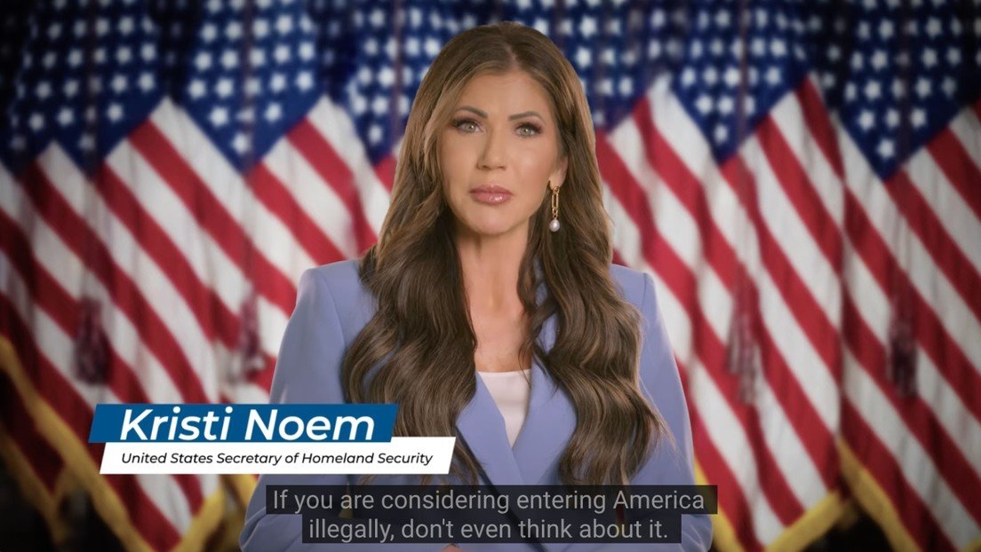 «Si eres un extranjero criminal que está considerando ingresar ilegalmente a los EE.UU.: ni lo pienses. Si vienes aquí y violas nuestras leyes, te encontraremos y te deportaremos. Los criminales no son bienvenidos en los EE.UU.», dice Noem en el video, que dura un minuto.