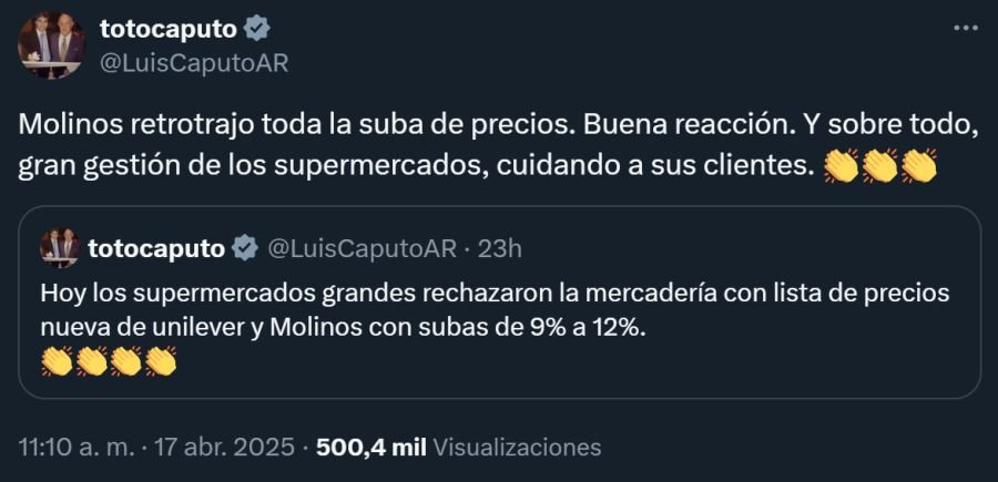 “Molinos retrotrajo toda la suba de precios. Buena reacción. Y sobre todo, gran gestión de los supermercados, cuidando a sus clientes”, escribió el titular del Palacio de Hacienda a través de su cuenta de X (antes Twitter). Horas atrás, ya había apoyado que «los supermercados grandes rechazaron la mercadería con lista de precios nueva de Unilever y Molinos con subas de 9% a 12%».