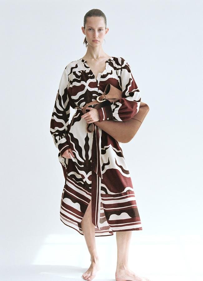 Vestido caftán midi en mezcla suave de algodón y viscosa con cuello mao, abertura en V y botonadura frontal. Es un modelo de corte holgado con cinturón de anudar extraíble y canesú fruncido delante y detrás. Precio: 39,99 euros.